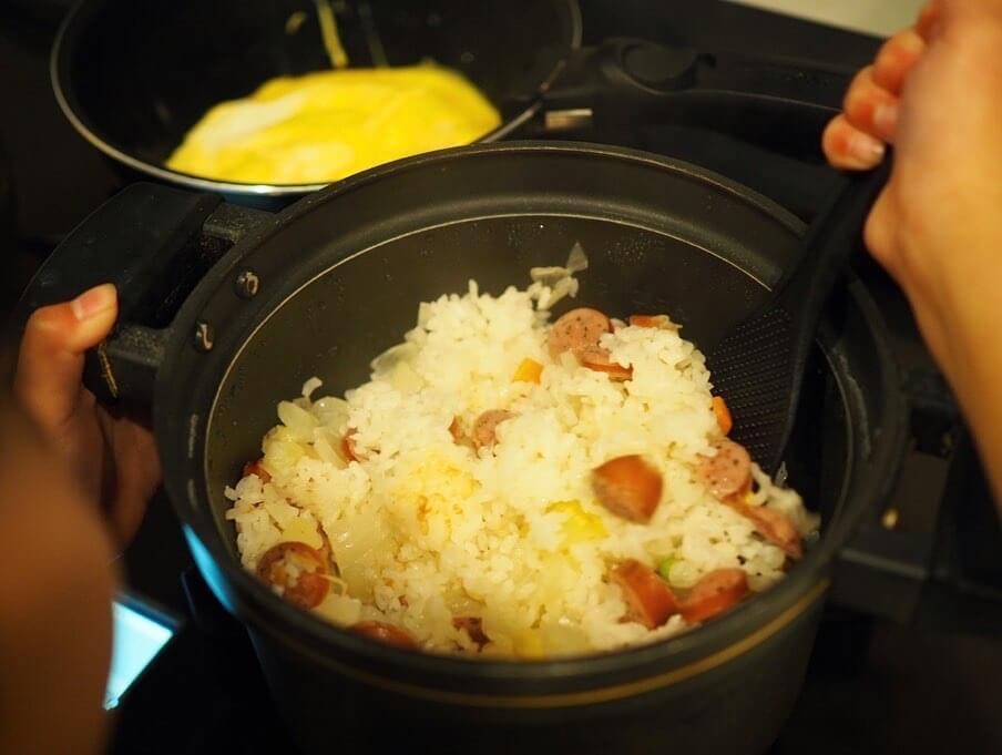 野菜を炒めたり、炊けた米をフライパンで炒める工程を丸々カットできるので、とても時短できる炊き込みごはんのピラフバージョンです。