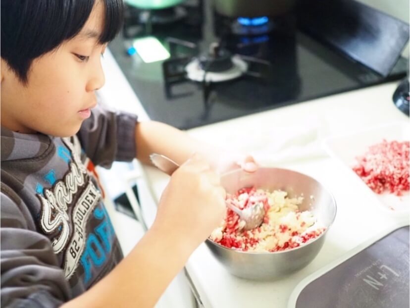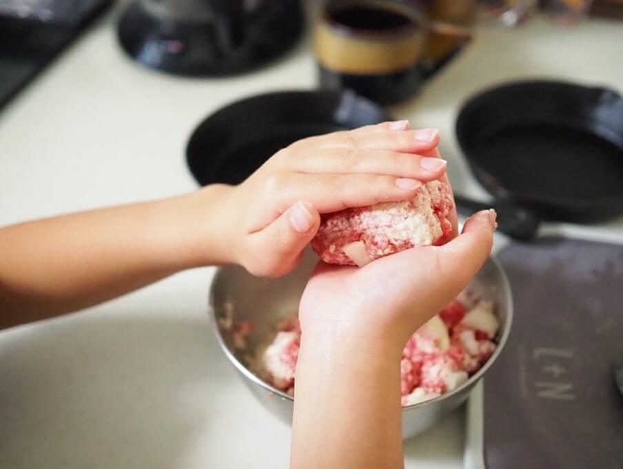 (3)ひき肉、塩こしょうを加え全体を混ぜたら、楕円形に成型する