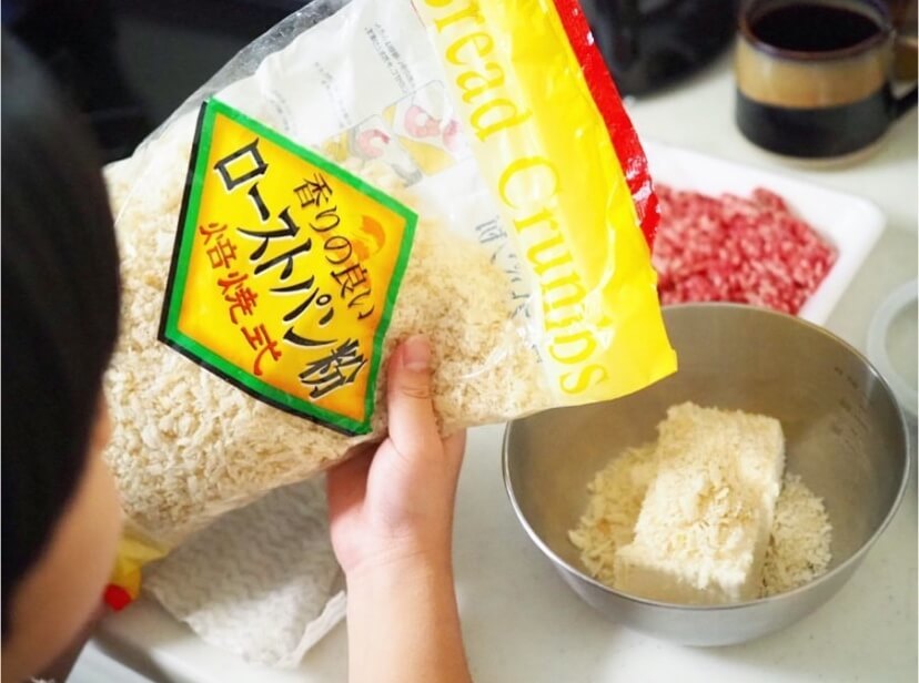 (1)ボウルに豆腐とパン粉を入れて混ぜ合わせる(豆腐の水分があるので卵や牛乳は使いません)