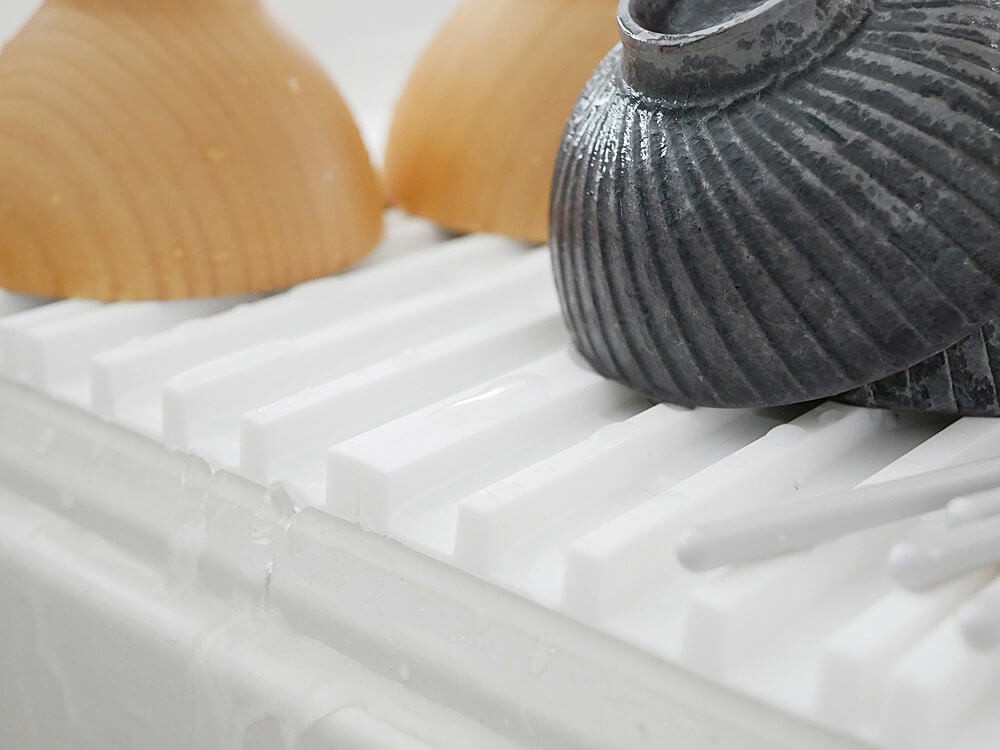 大きな凹凸が特徴のトレーは、平らな面でお皿を支え、凹んでいる部分に自然に水が落ちる構造。