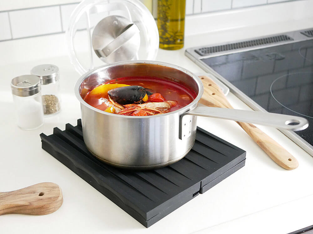 熱に強いシリコン製なので、調理中の熱々のお鍋の一時置きや、食卓でもシンプルな鍋敷きとしても使えます(2つ折:幅20X奥行25X高さ2.6cm)。