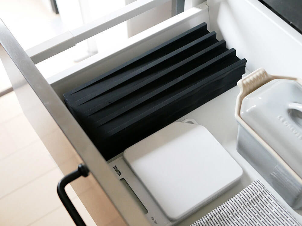 洗い物が多いときなどに使うサブの水切りとしてお使いの場合は、コンパクトに収納できるのはポイント高いです(4つ折:幅10X奥行25X高さ5.2cm)。