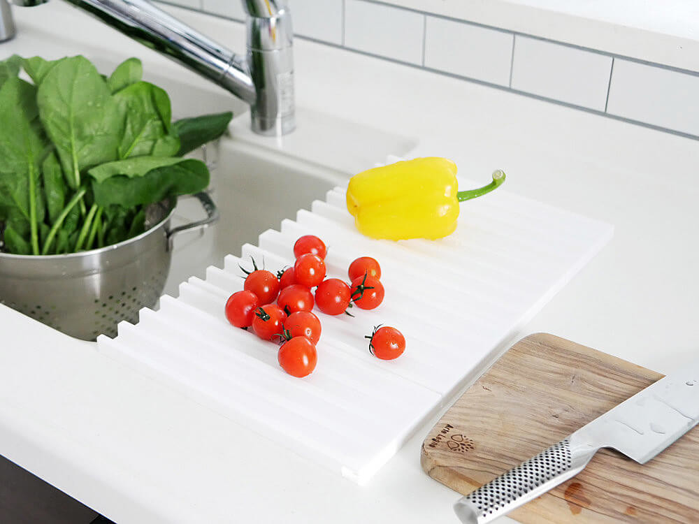 ライフスタイルに合わせてマルチに使える水切りトレーは、洗った野菜の一時置きにも◎。折り畳んでコンパクトになるので、1つあるととっても便利なアイテムです。