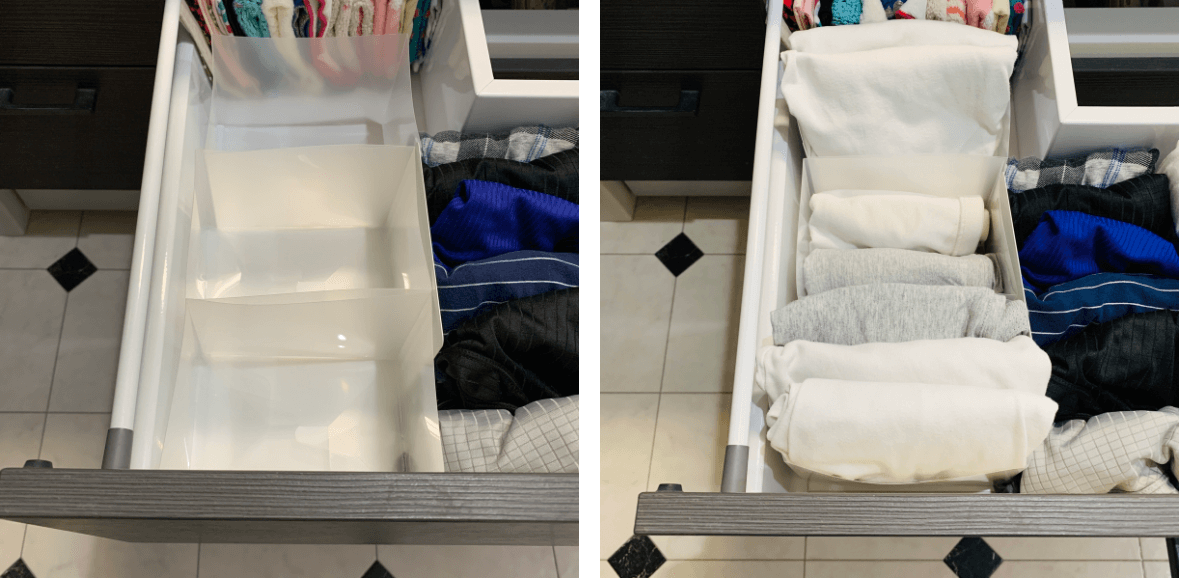 そこで下着の向きを変えるなどして分けているのですが、女性陣(フネと娘二人)のタンクトップ・キャミソールが薄いので自立しないんです。「立てて収納」が基本なのですが、テロテロと倒れてしまっていました。