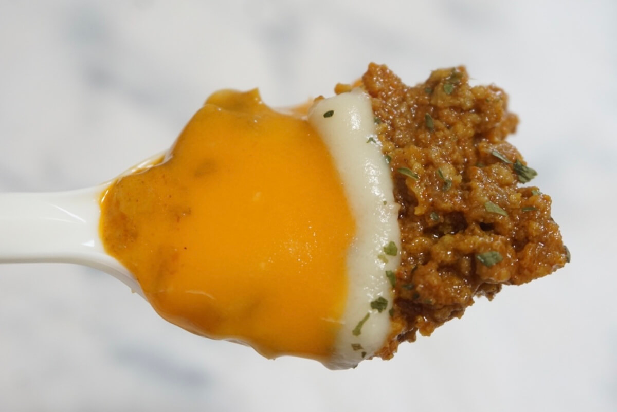 たしかに卵黄とチーズソースが合わさってマイルドになり、食べやすくなりました。