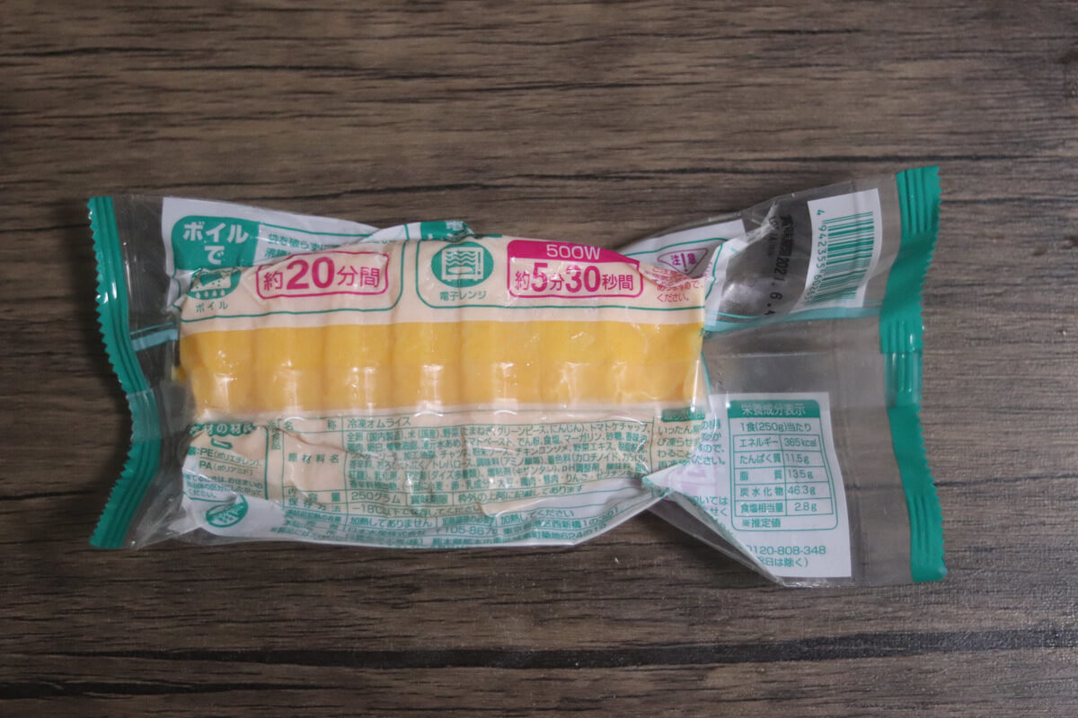 袋が張り付いていて見えづらいですが、作り方はボイルで約20分、500Wの電子レンジで5分30秒温めるだけです。
