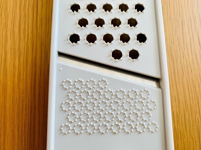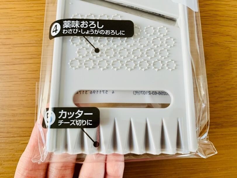 オープン!おろし用と薬味おろしは表、皮ひきとスライサーは裏面を使います。カッターはおそらく縦に使うので裏表関係なさそうです。