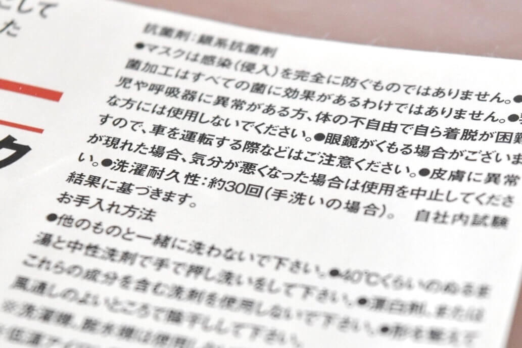 1つ目がサイズ。成人男性でちょうどいいくらいのサイズなので、女性(普段小さめサイズを使っている方)にはかなりゆるく感じます。それぞれ1サイズのみの展開なので、子ども用や小さめサイズが出るといいなと感じました。