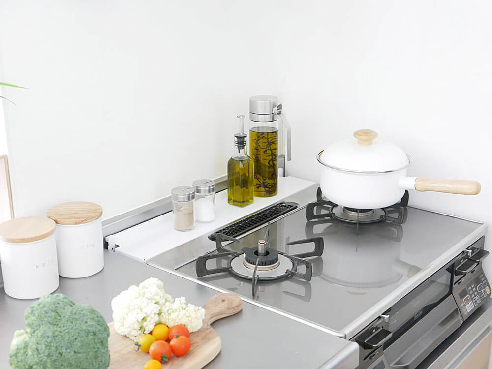コンロ奥の隙間をなくす役割だけでなく、フラットになることで調理道具やスパイスの一時置きにも便利。