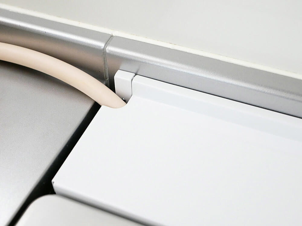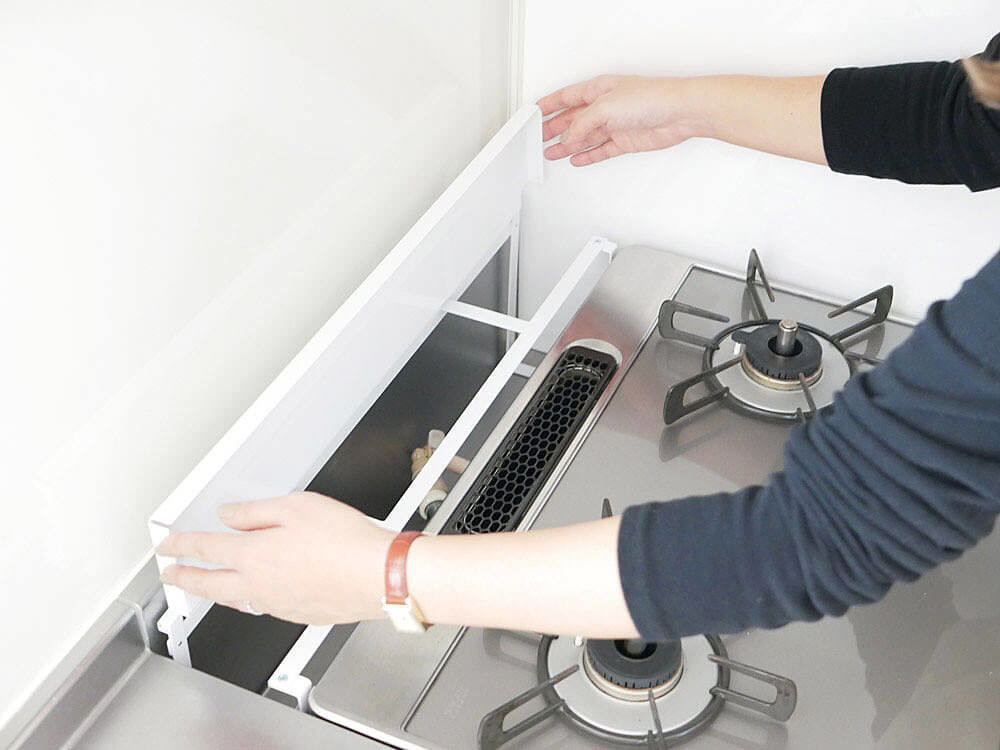 棚板は上に開くので、ラックを設置したままガスの元栓の開閉が可能です。