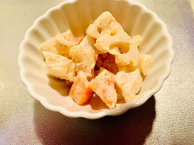 ニンジンとすりゴマのマヨ和えサラダで食べました。食感はちょっと柔らかめ。ほんのり甘みもあります。