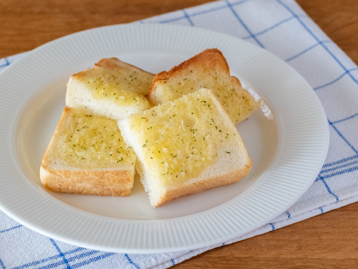 「刻みにんにくのオイル漬け」を使用することで、とても手軽にガーリックトーストを作ることができます。