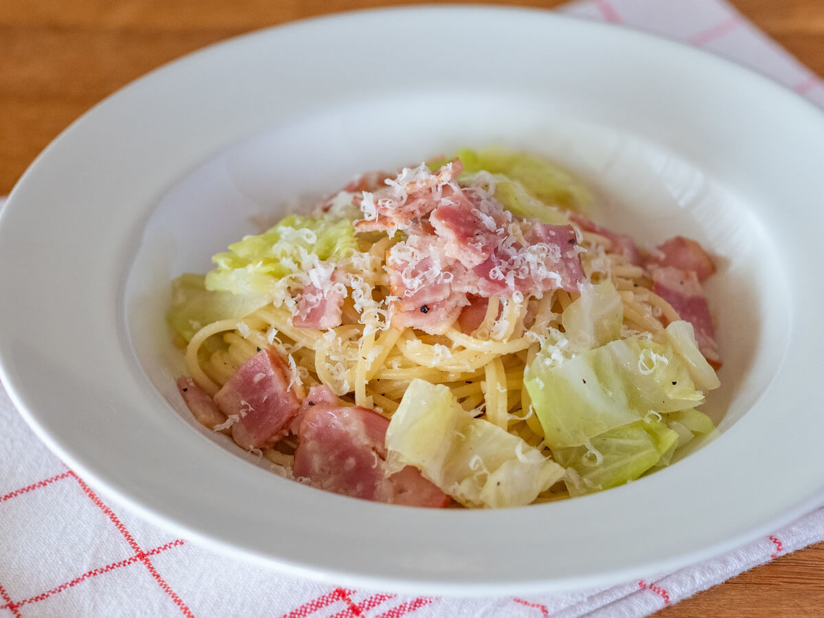 パスタとキャベツは一緒に茹でておき、フライパンに少量のオリーブオイルを入れてカットしたベーコンを炒めます。