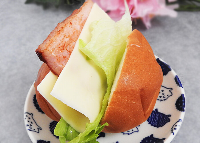 - レタス・チーズ・厚切りベーコンの順にはさんだら完成