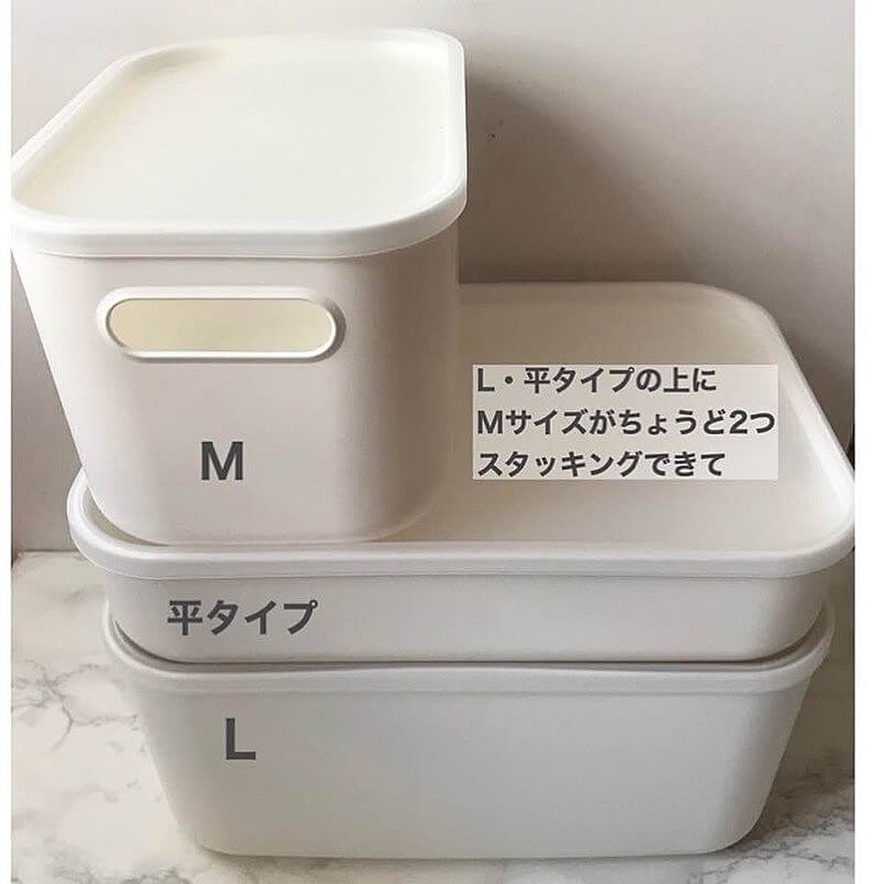 無印良品で人気の収納アイテム「やわらかポリエチレンケース」。フタは別売りですが、整理整頓された収納を実現するためには外せないアイテムです。