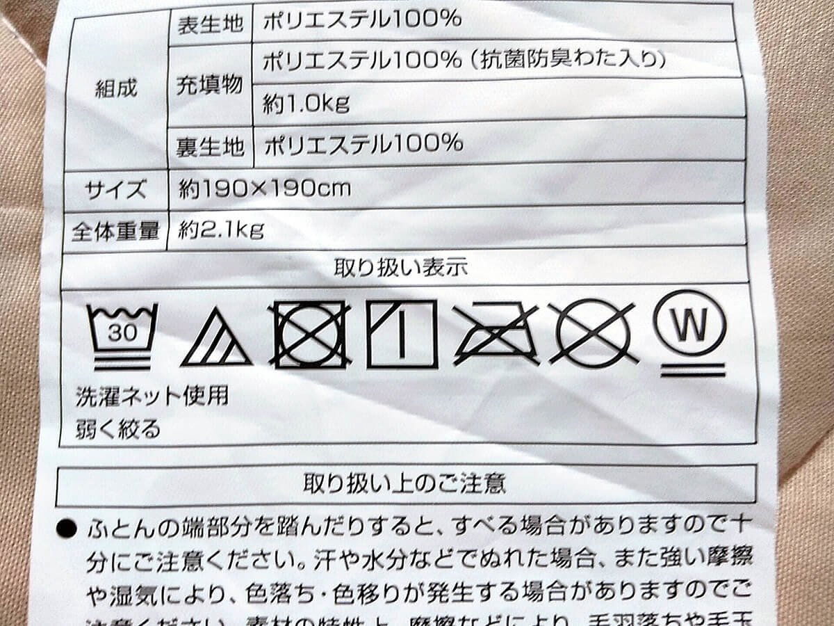 ラグを片付ける前に必要なのが、お洗濯です。 ズボラな私が使用しているのは、洗濯機で洗える敷布団タイプのラグ。洗濯表示にも洗濯ネットを使えば洗濯機で洗えることが書かれています。