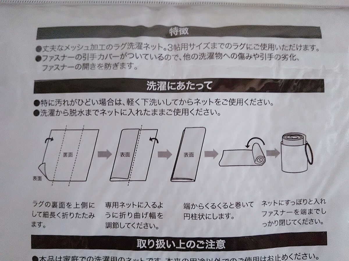 「これでも良いのでは?」と思いましたが、やっぱり用途に合った洗濯ネットが適しているんですね。 目が細かいネットだと、ラグの内側までしっかり洗えない可能性があります。