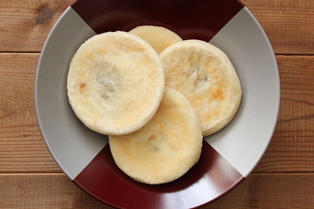 残り1つは、電子レンジで解凍機能を使って解凍し、オーブントースターで焼いてみたところ、フライパンで焼くよりもしっかりとパリッとなり、少し膨らみました。