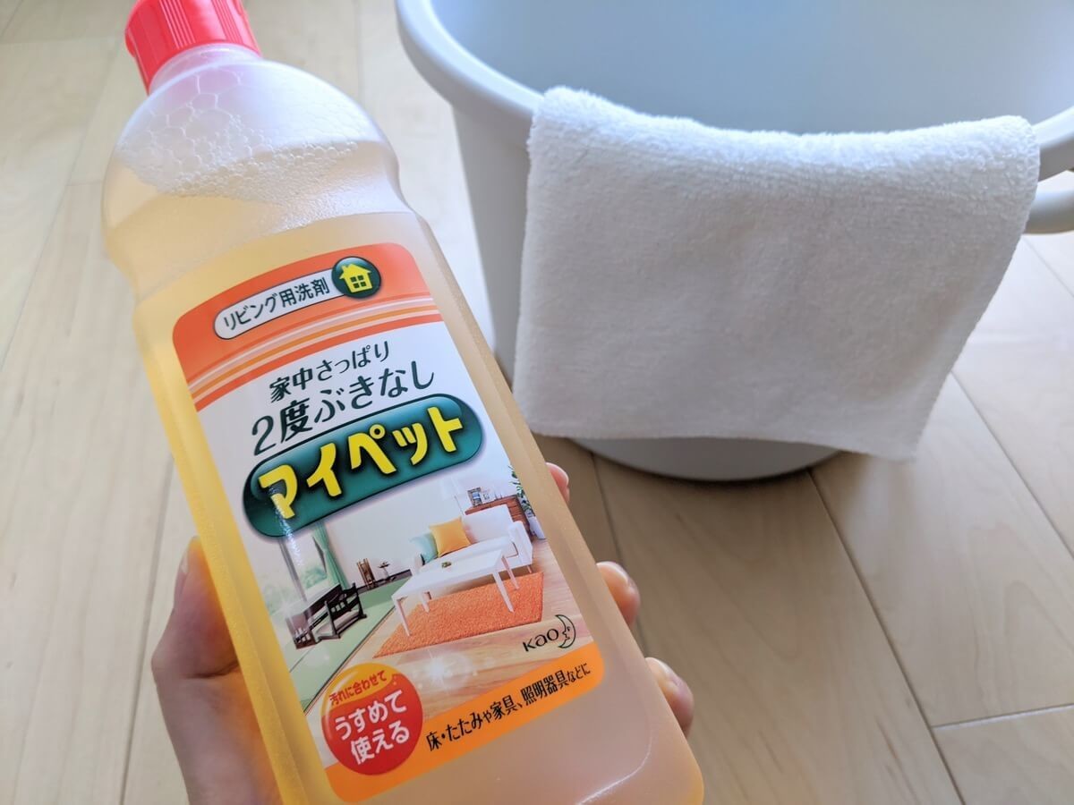広範囲の場合は、薄めるタイプの「マイペット」もおすすめです。 規定の量の洗剤を水で薄め、そこに雑巾をゆすいで硬く絞ってから雑巾がけをします。