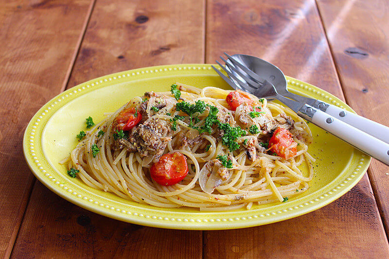 - 湯がいたパスタと(4)を和えて、味が足りない場合は塩で味を調えます。