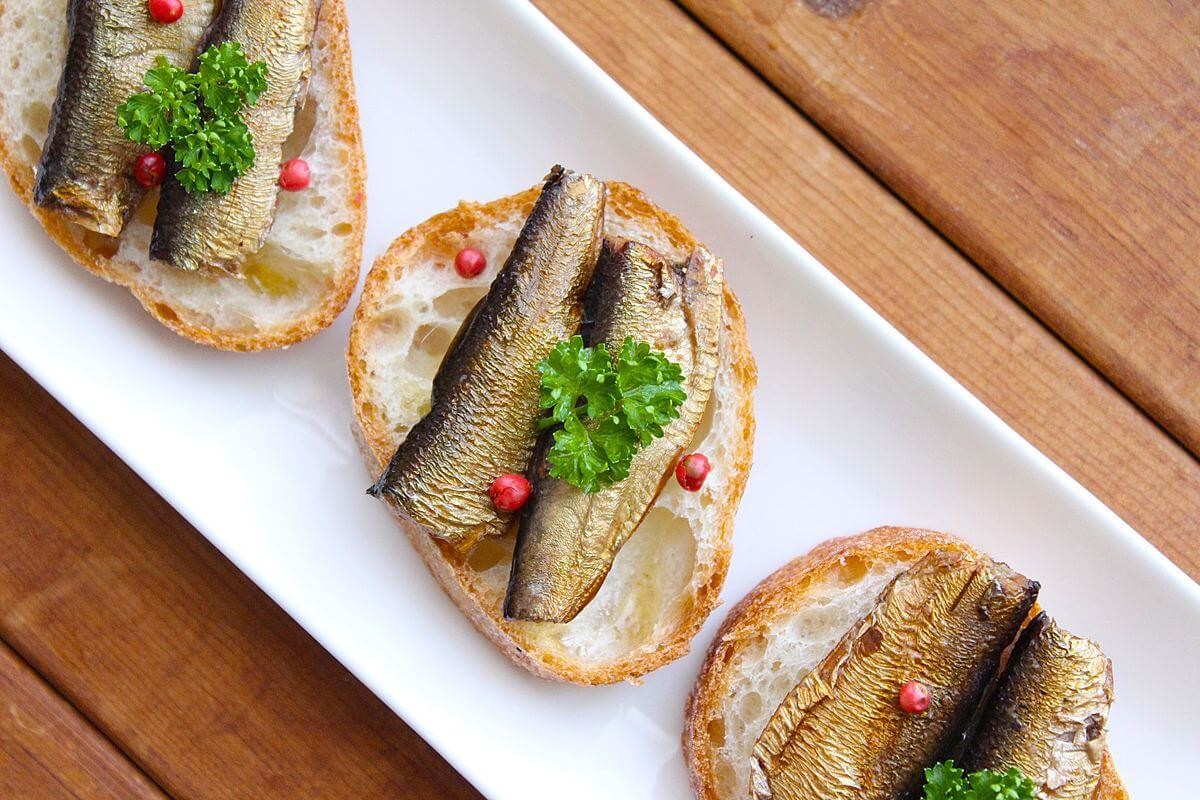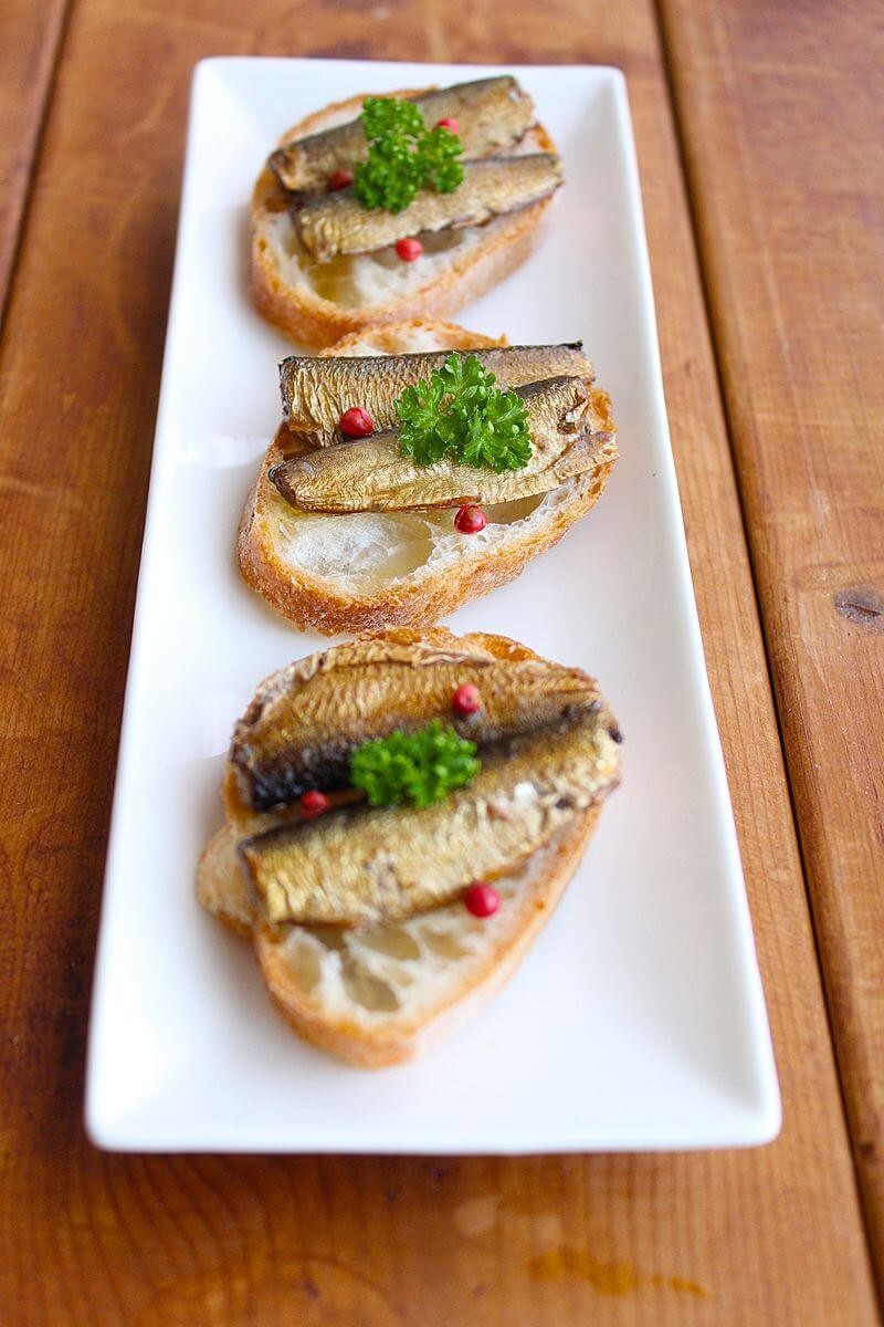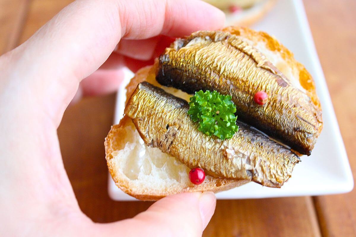 軽くトーストしたバゲットにスモークオイルサーディン、パセリ、ピンクペッパーをのせます。