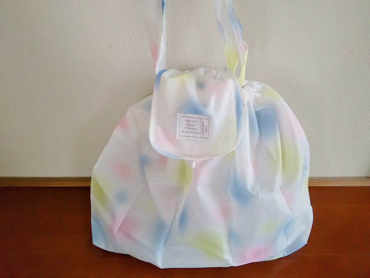 カバーの取り付け方は簡単。カバーを広げて、下からバッグにかぶせるだけ。口が巾着のようになっていて、きゅっと紐をしぼると上からの雨が防げる仕組みです。