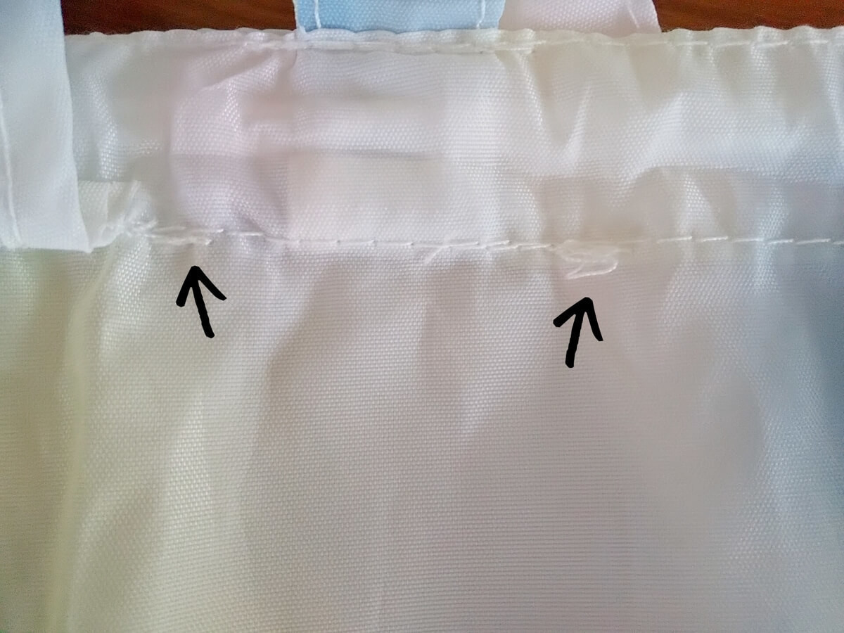 矢印をつけた部分は、縫製が甘いですよね。購入後に気づきました。 一部分だけだし、使用上の問題はありません。300円というお値段を考えたら仕方ないかな?とも思いますが、気になる人は購入前にチェックした方が良いかもしれません。