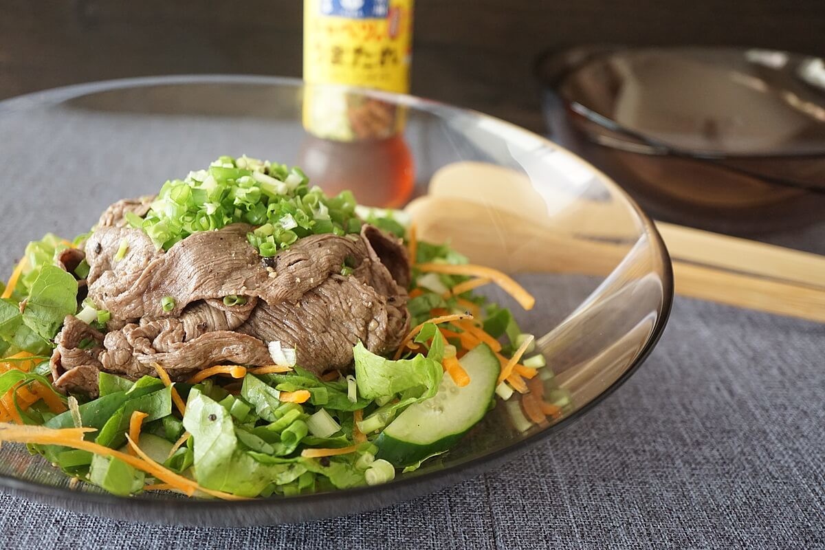 ロメインレタス(またはレタス)、きゅうり、ニンジンなどのサラダの上に脂身の少ない牛コマや切り落としを焼いたものをのせ、ネギをたっぷりちらしたサラダです。