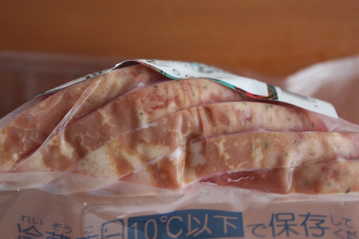 よく見ると、豚バラ肉と、粗挽き豚肉をつけて加工してあるということがわかります。