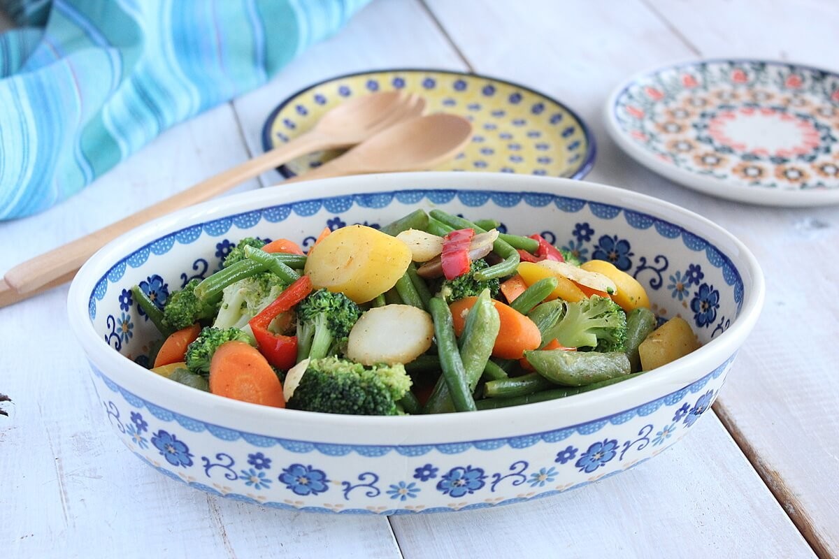 野菜は、ブロッコリー、スナップエンドウ、さやいんげん、人参、黄人参、マッシュルーム、赤パプリカ、シログワイ、玉ねぎの9種類入っています。
