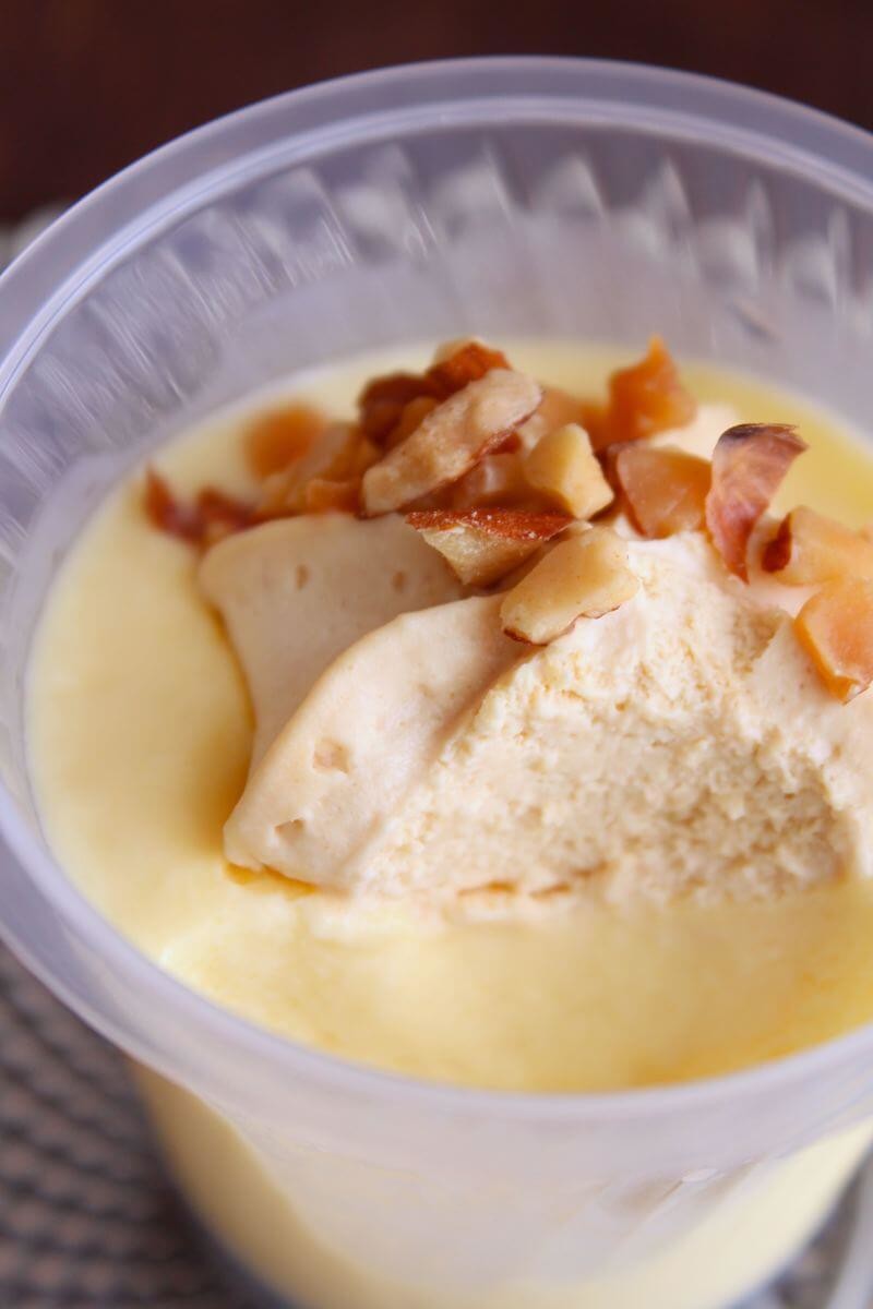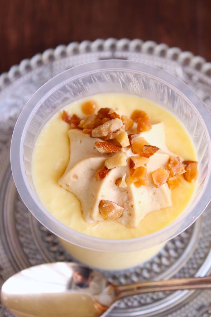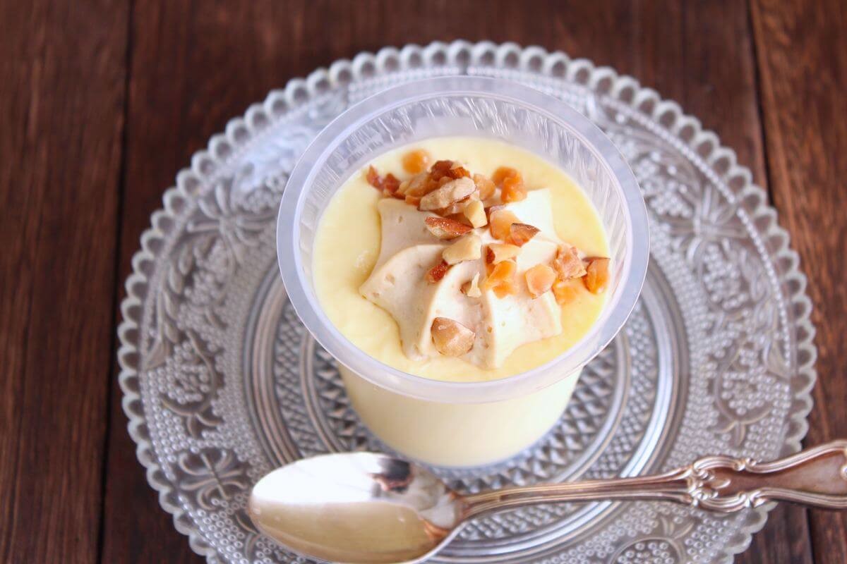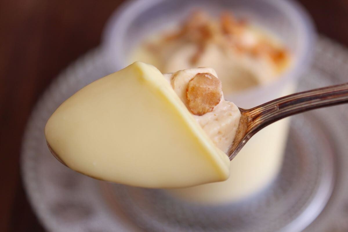 なるほど、これ、カラメルソースが底にない分、プリンの上にトッピングされたクリームがキャラメル風味なので、カラメルの代わりをしています!