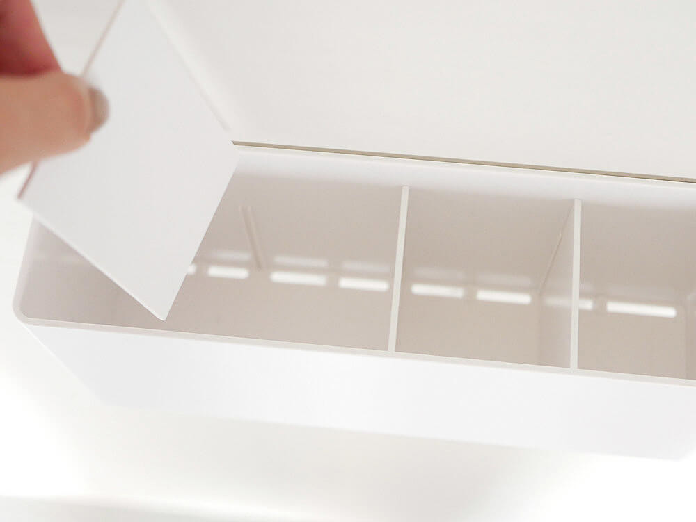 ボックスには付け外し可能な仕切り板がついていて仕分けに便利です。仕切り板はさしこむだけで、取り外しも簡単。