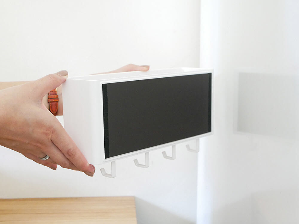 towerの「マグネットストレージボックス」のワイドタイプは、細かく仕切られるので、細々とした雑貨をスッキリ綺麗に収納できるのが特徴、フックも使ってさらに有効活用!