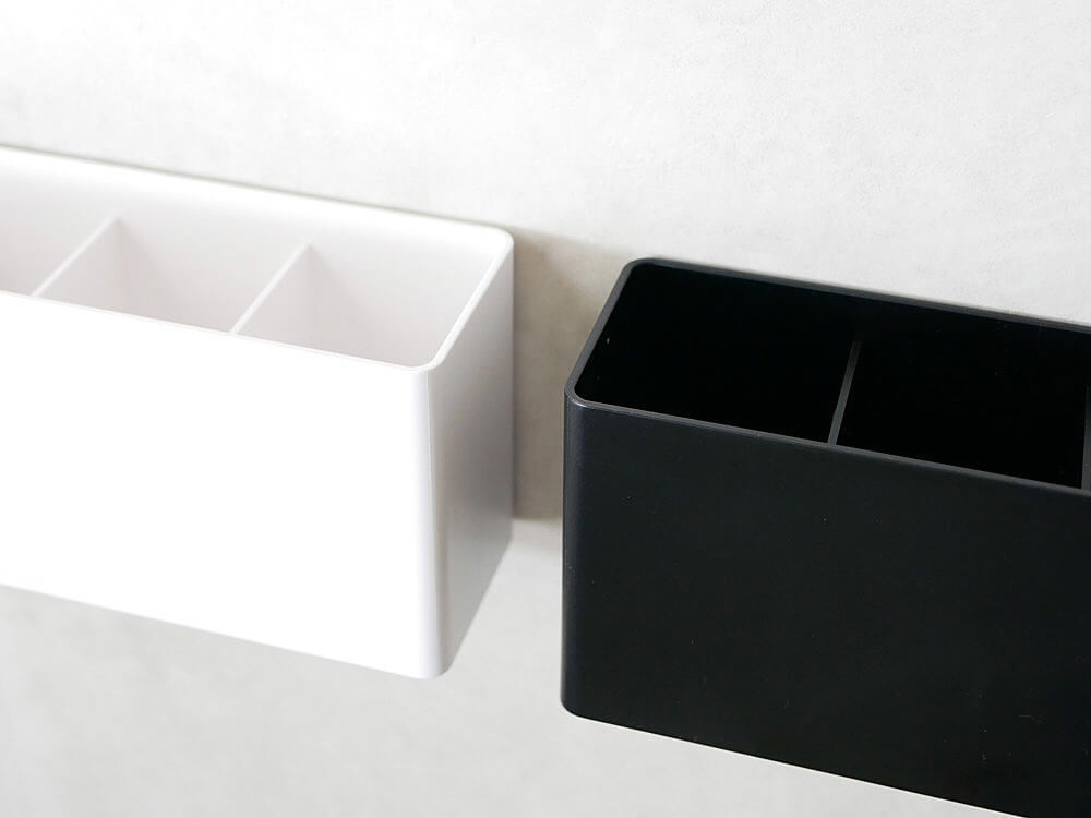 ホワイトとブラックの2カラー、モノトーンなのでどこに置いても馴染んでくれます。また、角は丸みをつけ柔らかい印象に、それでいて並べて置いてもすっきり見せてくれるのが特徴。
