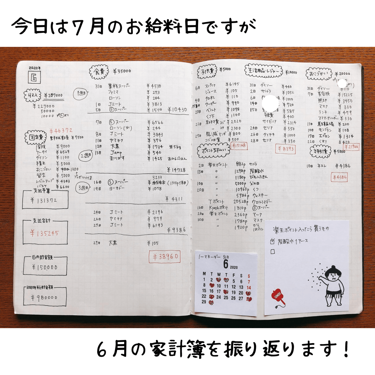 大事なのは食費がいくら、日用品がいくら……ではなく「トータルで、いくら使って、いくら残ったか?」なので、1か月全体の支出を振り返って、赤字でなければ良しとしています。