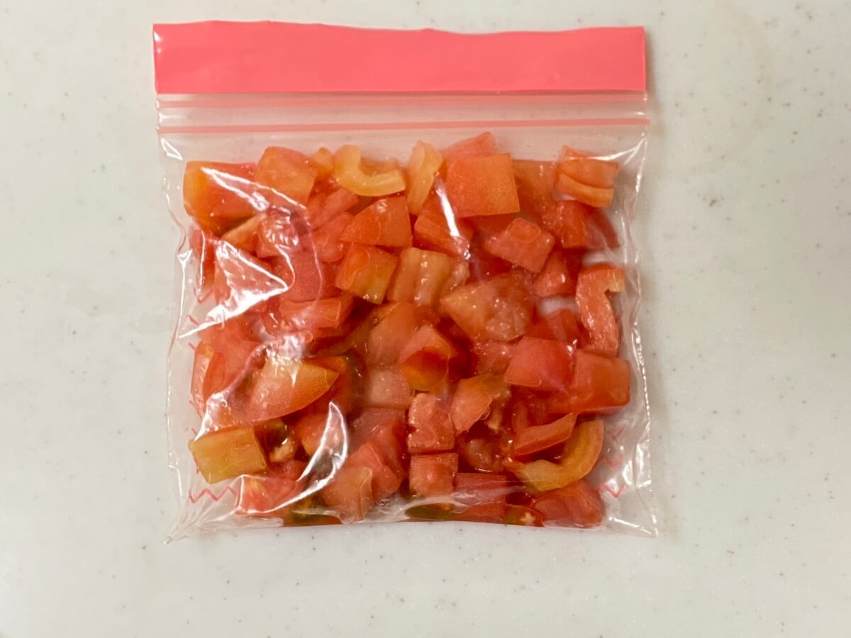 トマトをざく切りにして、ジップ付き保存袋に入れて冷凍します。冷凍する時は、「平らに」して冷凍するのがポイントです。使う時は袋の上からポキッと折って使います。