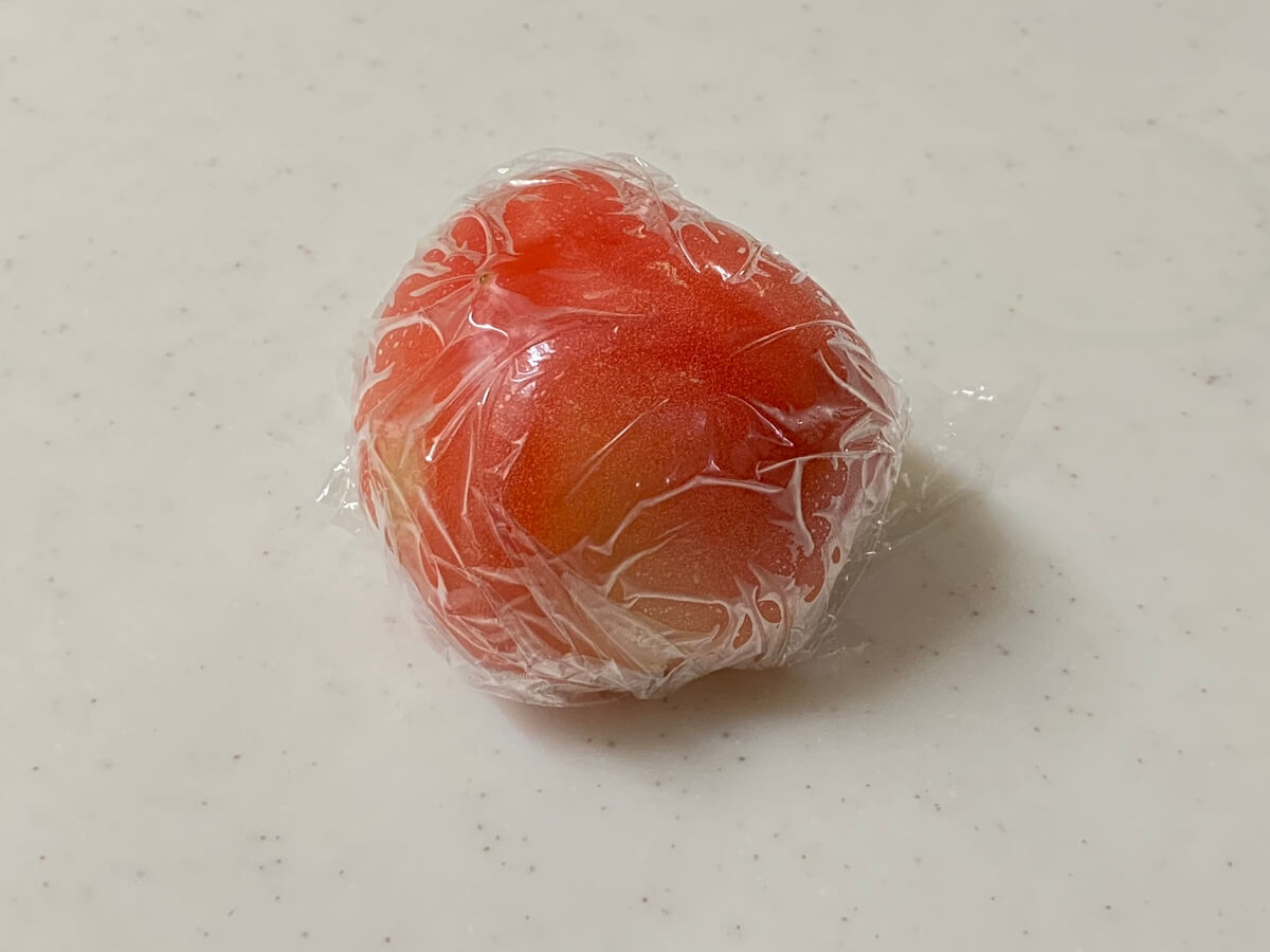 トマトのヘタを取り除き、そのままラップをして冷凍保存します。使う際に水につけると、皮がスルッと剥けますよ♪面倒な湯むきもしないで済むのでオススメです。トマト煮やミートソースを作る時に便利です。