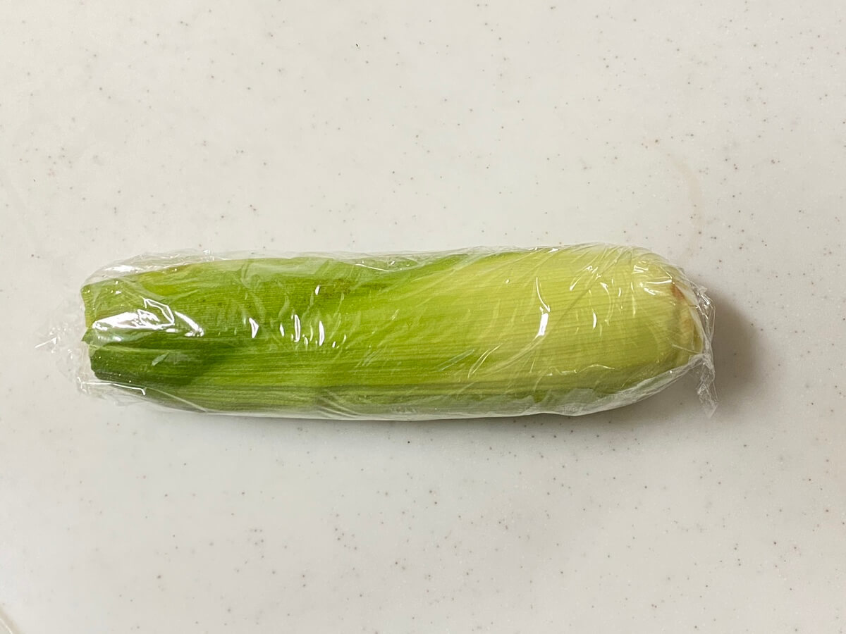 とうもろこしは皮のままラップに包みます。食べる時は、このままレンジでチンするだけ♪皮の香りがふわっと香って、さらに美味しくなります。