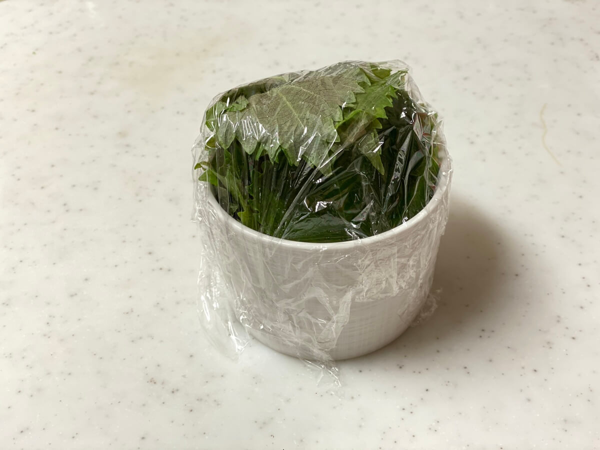 大葉は3~5枚を1セットにし、キッチンペーパーに包みます。さらにこれをラップで包みます。使う時はラップの上から軽くもむと小さくなるので、包丁いらずで便利です。