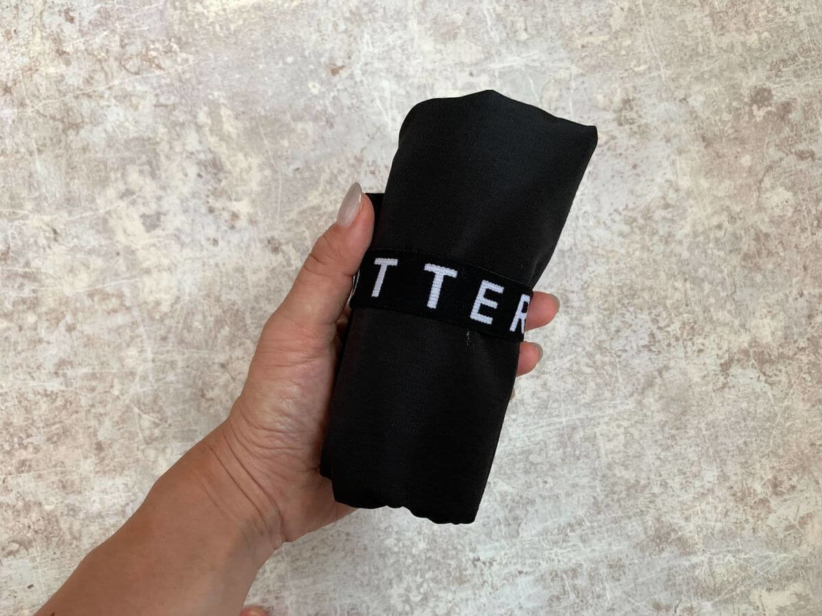 たたみ方は簡単。持ち手をたたみ、サイドを折って、くるくる丸めて、エコバッグについているゴムバンドで留めたらOKです。不器用な私でも、直感的に折りたためます。