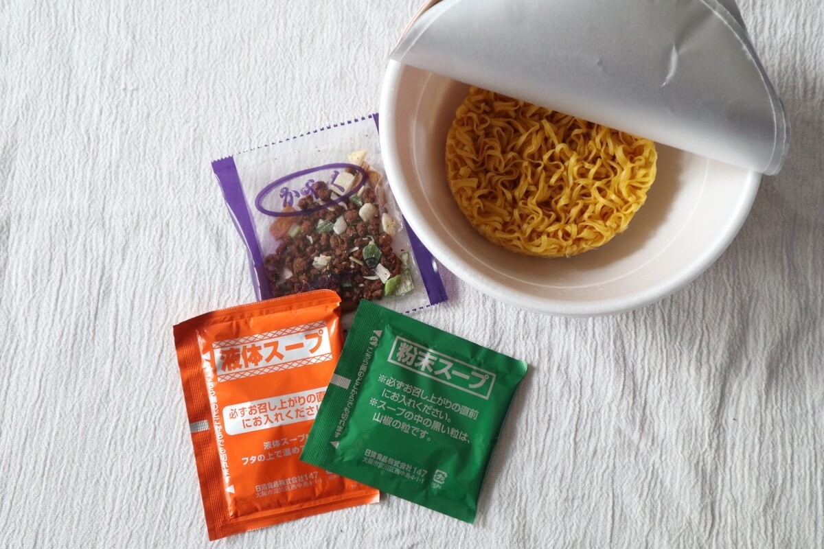 そぼろやメンマが入ったかやく、液体スープ、粉末スープが入っており、麺はちぢれ麺。