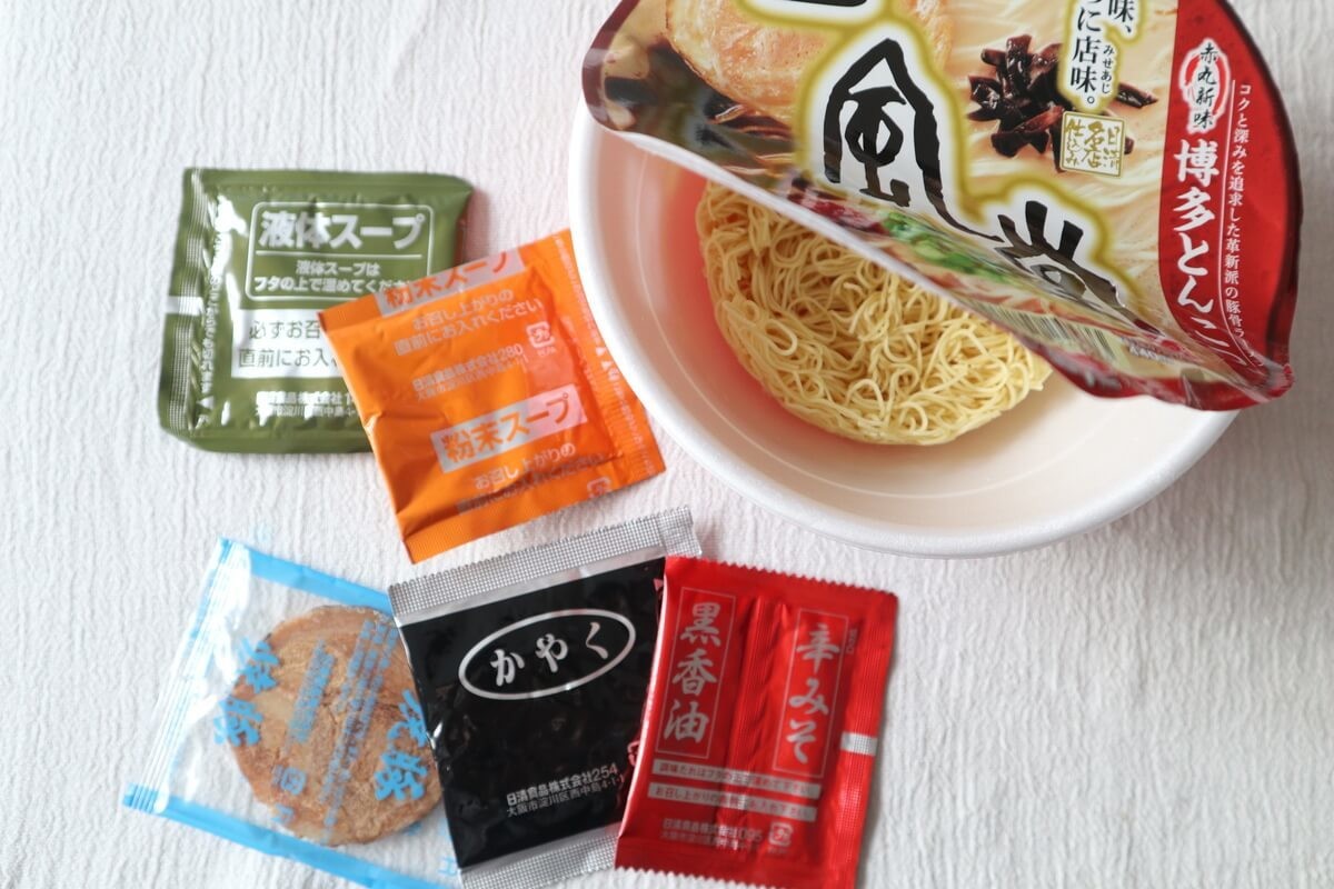 きくらげなどが入っているかやく、チャーシュー、液体スープ、粉末スープ、黒香油、赤みそが入っています。