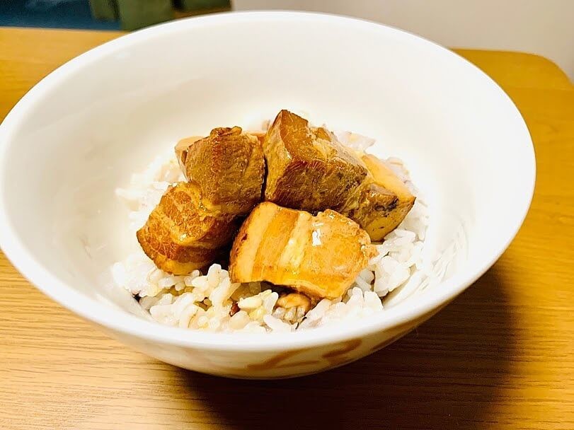 ご飯に乗せて角煮丼にしました!スープもご飯にたっぷりとかけました。