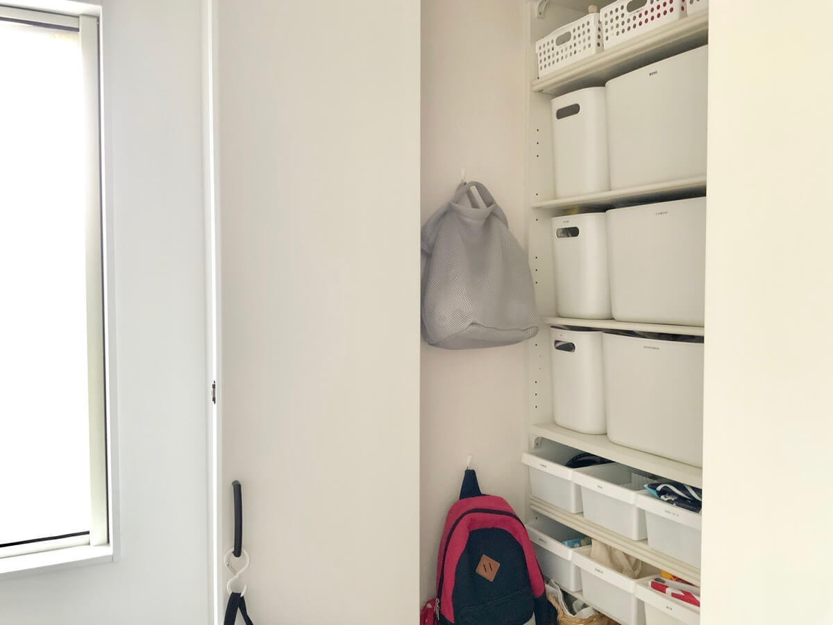 こちらのメッシュバッグに収納するようになってからは、いつでも遊べるように、玄関クローゼットの壁に引っ掛けています。