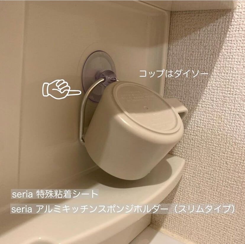 @yu_______m215さんがコップホルダーとして使用しているのは、セリアで販売されているアルミキッチンスポンジホルダー!