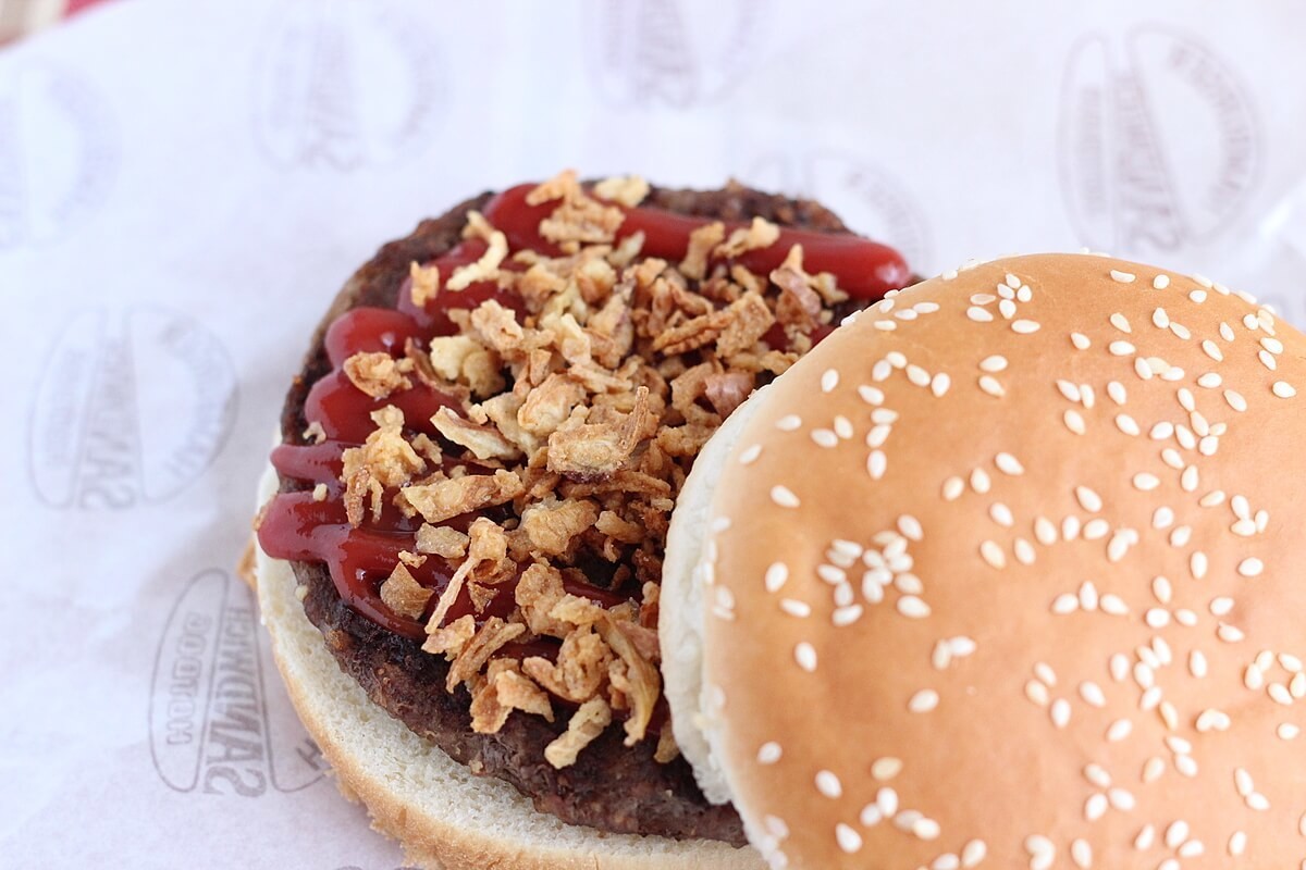焼いたものをバンズにのせ、玉ねぎとケチャップものせると、