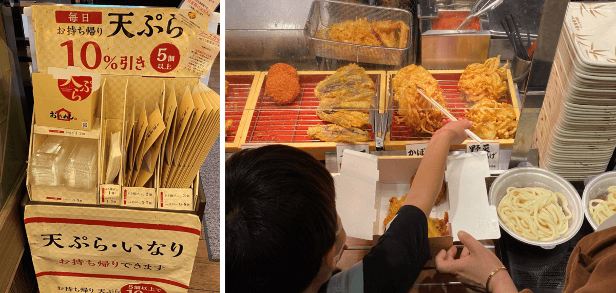 うどんは、ぶっかけ(温・冷)、かけ(温・冷)の2種類からお好みでチョイス、天ぷらは、お店で販売しているものから、どれでも好きなものを選ぶことができます。さらに、ジューシーな「いなり」が人数分ついているから、家族4人でもたっぷりと楽しめそうです♪