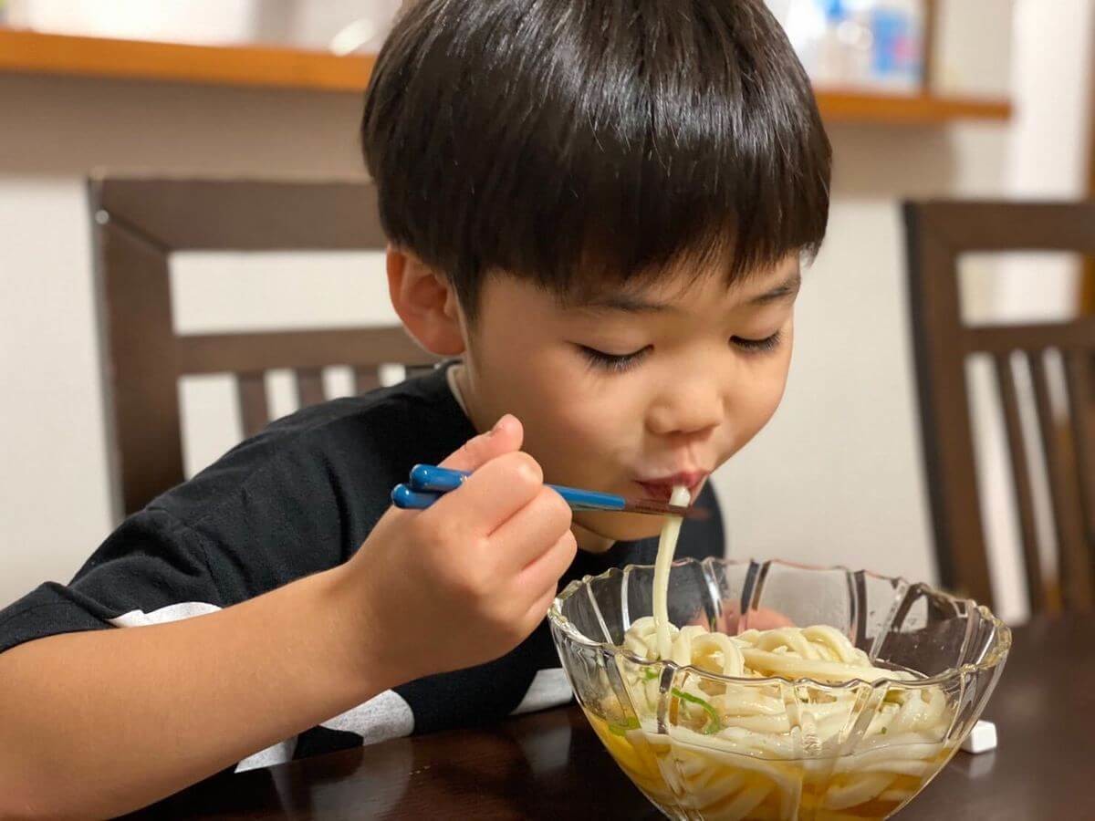 次男も「これぜんぶ食べていいの?」と、目を輝かせていました。子ども達は食いしん坊なので、普段はうどんだけの食事だとお腹がいっぱいにならず、1~2時間後には「お腹すいた」と言い出す腹ぺこモンスターです(笑)。でも、今回の「打ち立てセット」は、天ぷら&いなりをプラスしたおかげで腹持ちも良く、大満足だったようです。