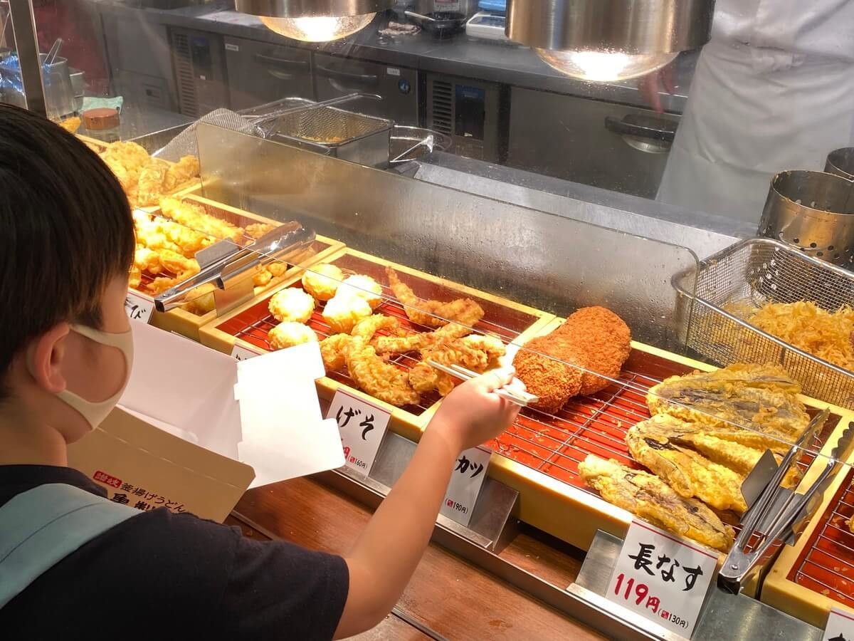 「丸亀製麺」の「天ぷら」は、子どもに食べてもらいたい、肉、野菜のバランスよい品揃えで、味に飽きないところもいいところ。いなりまでついてきて、子どもも大喜びでした!