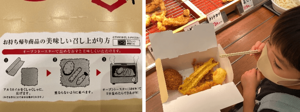 今、コロナ禍で持ち帰りメニューが増えていますね。私もそうしたサービスを見つけては、子ども達の好き嫌いに左右されないメニューを探したりしますが、以前からフードコートで食べている大好きな「丸亀製麺」の天ぷらがおうちで楽しめるのは感動もの。